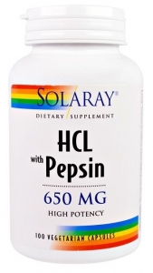 HCL con Pepsina 650 mg 100 Cápsulas Solaray es un producto para reequilibrar la acidez perdida en el estómago y así favorecer a la digestión de los alimentos en el estómago